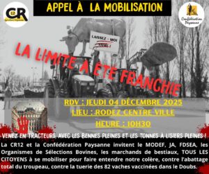 La Coordination rurale et la Confédération paysanne de l’Aveyron appellent à leur tour à manifester, après l’abattage du troupeau de Cédric Lhomme, éleveur laitier à Pouilley-Français (Doubs) — preuve que l’affaire prend désormais une dimension nationale.