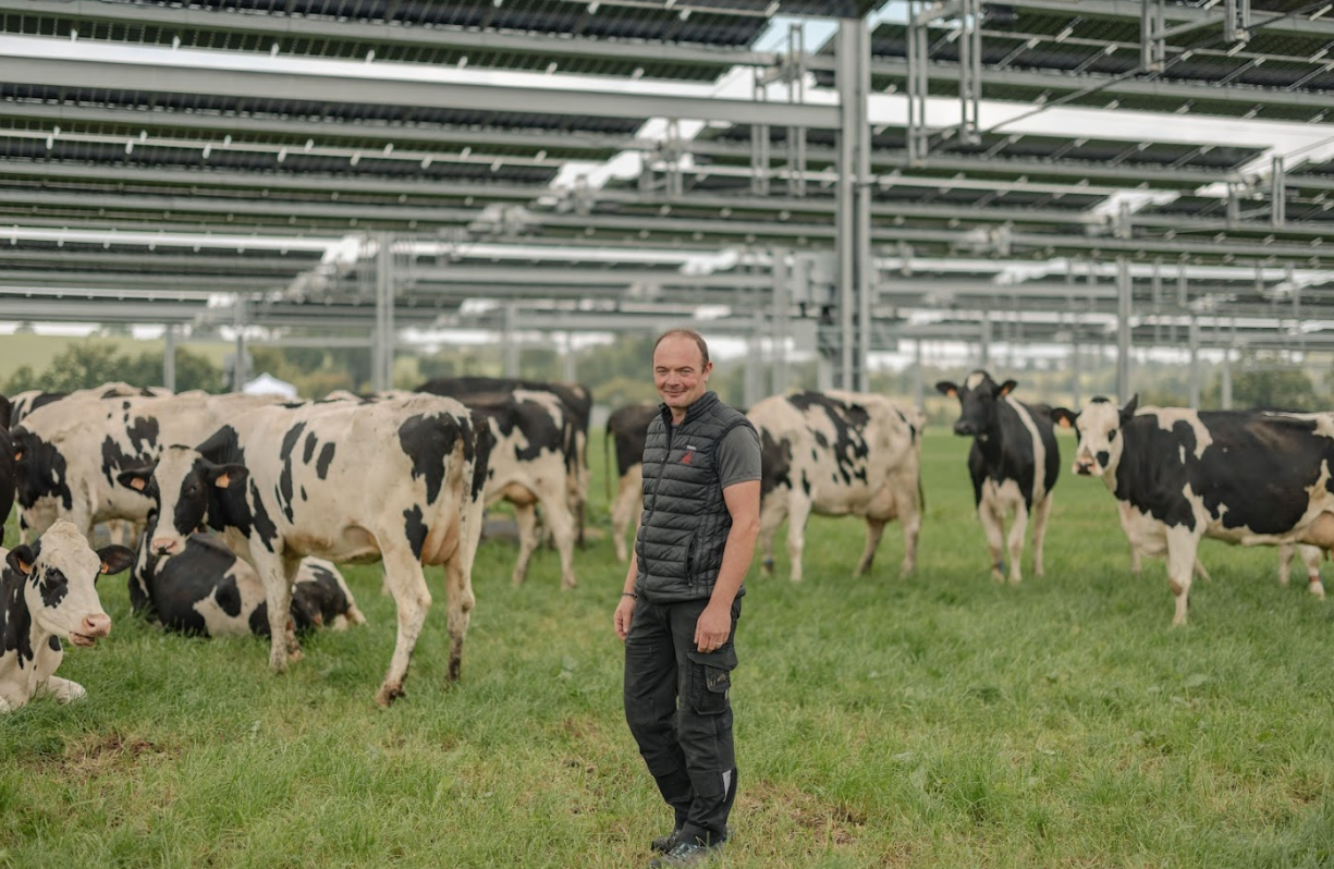 Côté Innovation : Yoan Bizet et Daphné Huet, éleveurs laitiers dans le Calvados, expérimentent une canopée agrivoltaïque, dédiée au pâturage d’un troupeau de 130 Holsteins.
